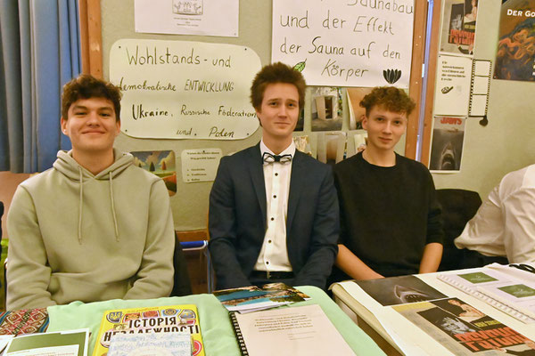 Neben den erwähnten drei Themen widmeten sich die weiteren Zwölftklässler Fragestellungen aus ganz unterschiedlichen Fachbereichen: Evolution, Materie, Fabrikzucker, Kinder- und Jugendarbeit, Saunabau, Zweisprachigkeit, Golfstrom, Ernährung im Sport, Wohlstands- und Demokratieentwicklung, Feminismus, Tiertherapie, Filmwirkung, Internet, Werbung und Schulsystemvergleich. Alle Schülerinnen und Schüler haben der Aufregung zum Trotz ihre Themenarbeiten souverän vorgestellt und wurden mit Applaus belohnt.